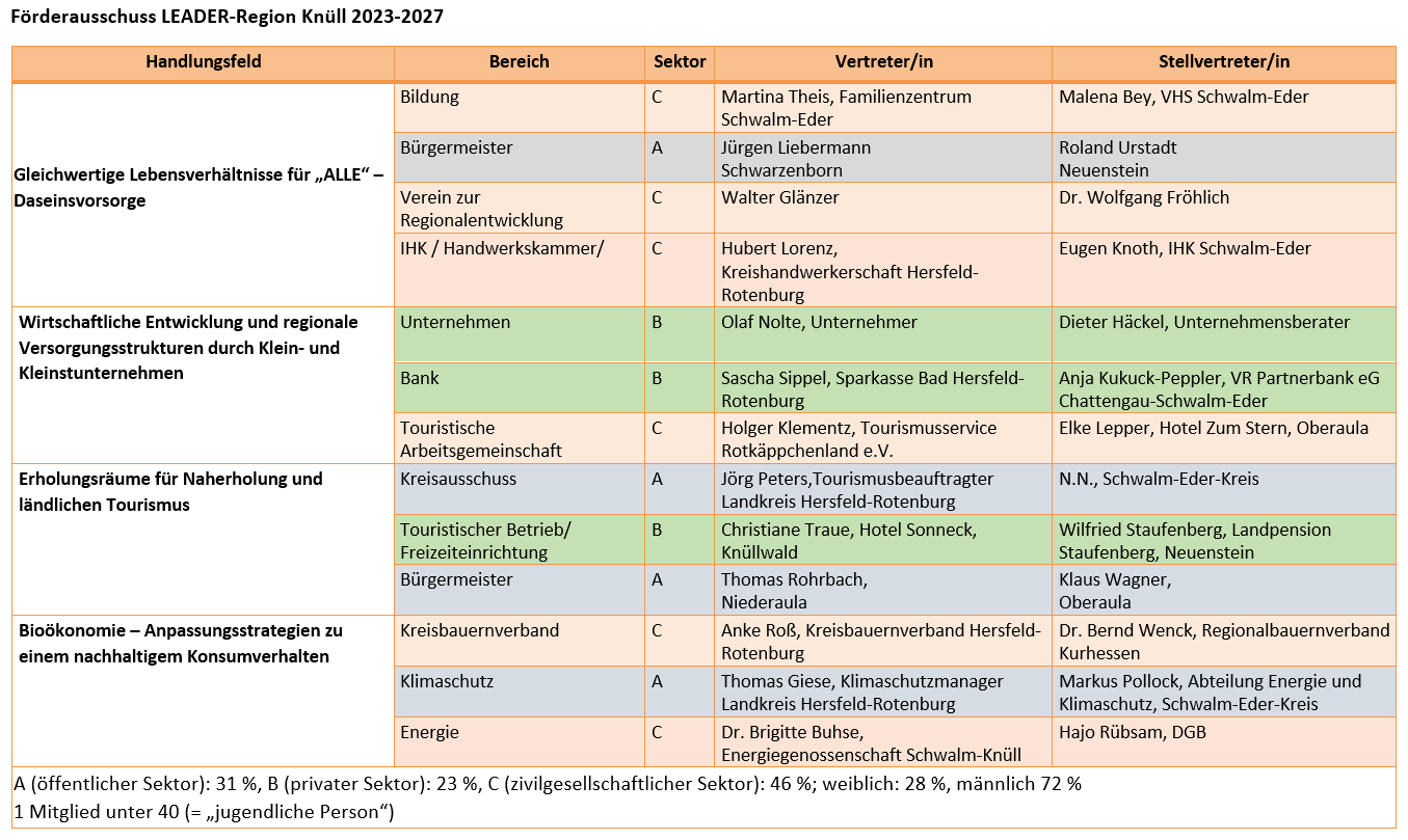 Für die Umsetzung der Lokalen Entwicklungsstrategie Knüll 2023-2027 wurde der Förderausschuss neu aufgestellt. Die Zusammensetzung wurde im Hinblick auf die Handlungsfelder der Entwicklungsstrategie angepasst. Die Akteure sind hochqualifiziert. Der Förderausschuss besteht aus 13 Personen, von denen maximal sechs als Vertreterinnen und Vertreter der öffentlichen Hand durch den Zweckverband Knüllgebiet benannt werden. Die mindestens sieben Vertreterinnen und Vertreter der Wirtschafts- und Sozialpartner bzw. der Zivilgesellschaft werden aus den Bereichen Kreishandwerkerschaft, Industrie- und Handelskammer, Bildung, Touristische Arbeitsgemeinschaft, Energiegenossenschaften, Verein zur Regionalentwicklung und der in der Region tätigen Banken und Sparkassen sowie der Unternehmen in den Bereichen Tourismus und gewerbliche Wirtschaft benannt. Die Benennung von Vertreter/innen aus weiteren Bereichen ist möglich.